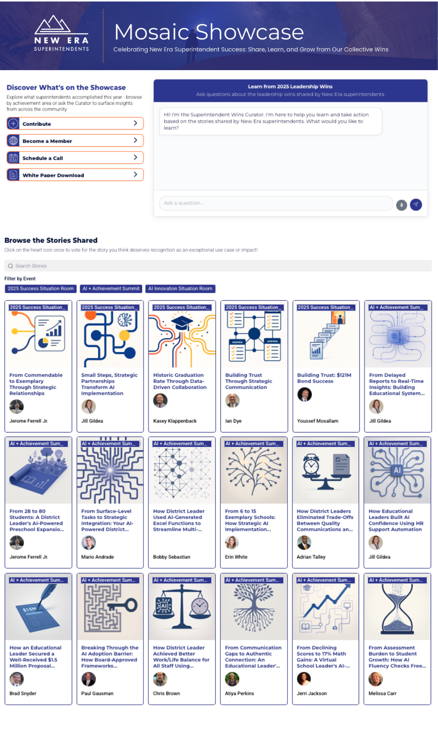 Mosaic is an Al-powered platform that helps groups capture and showcase summit attendees success stories. Through custom Al interviews, participants easily share their wins and experiences. The platform then transforms these stories into searchable insights, helping facilitate powerful & meaningful, experience-driven conversations.